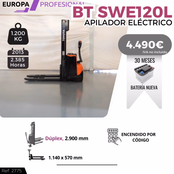 TIPO DE MAQUINA: APILADOR ELECTRICO MARCA: BT MODELO: SWE120L TRACCIÓN: ELÉCTRICA CAPACIDAD: 1.200 KG AÑO: 2013 HORAS: 2.385 MÁSTIL: DÚPLE ELEVACIÓN: 2.900 MM TAMAÑO HORQUILLAS: 1.140 X 570 MM EXTRAS: 30 MESES DE GARANTÍA EN BATERÍA NUEVA, ENCENDIDO POR CÓDIGO