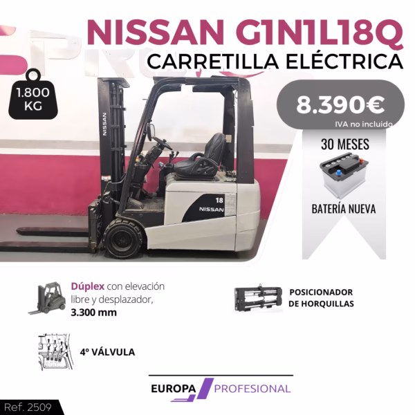 TIPO DE MAQUINA: CARRETILLA ELEVADORA MARCA: NISSAN MODELO: G1N1L18Q TRACCIÓN: ELÉCTRICA CAPACIDAD: 1.800 KG MÁSTIL: DÚPLEX CON ELEVACIÓN LIBRE Y DESPLAZADOR ELEVACIÓN: 3.300 MM EXTRAS: 30 MESES DE GARANTÍA EN BATERÍA NUEVA, 4º VÁLVULA, POSICIONADOR DE HORQUILLAS