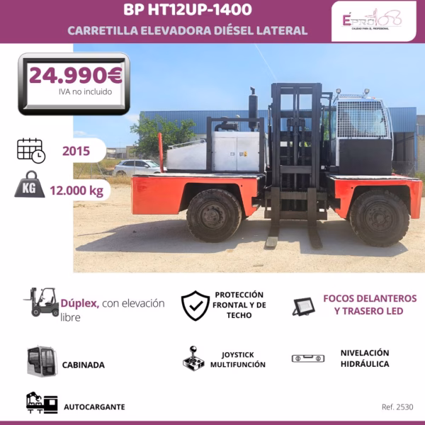 TIPO DE MAQUINA: CARRETILLA ELEVADORA LATERAL MARCA: BP MODELO: HT12UP-1400 TRACCIÓN: DIÉSEL CAPACIDAD: 12.000 KG AÑO: 2015 MÁSTIL: DÚPLEX CON ELEVACIÓN LIBRE EXTRAS: CABINADA, AUTOCARGANTE, PROTECCIÓN FRONTAL Y DE TECHO, JOYSTICK MULTIFUNCIÓN, FOCOS DELANTEROS LED, NIVELACIÓN HIDRÁULICA.