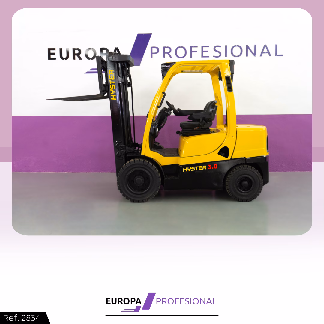 Carretilla diésel Hyster. Año 2015. Modelo: H3.0FT. Capacidad: 3.000 kg. Mástil tríplex con elevación libre y desplazador, con una altura de 4.776 mm. Luna delantera. Luces delanteras y trasera LED. Referencia: 2834