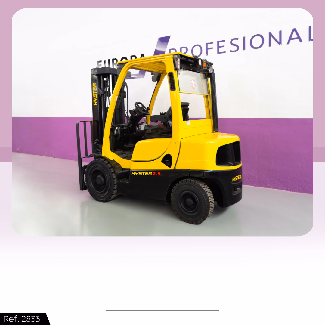 Carretilla diésel Hyster. Año 2016. Modelo: H2.5FT. Cuenta con tan solo: 3.563. Capacidad: 2.500 kg. Mástil tríplex con elevación libre y desplazador, con una altura de 5.000 mm. Luna delantera. Ruedas delanteras nuevas. Luces delanteras y traseras LED. Referencia: 2833