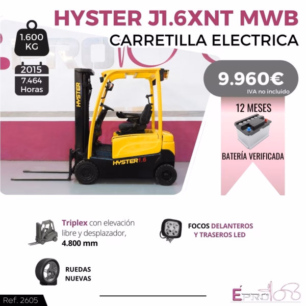TIPO DE MAQUINA: CARRETILLA ELEVADORA MARCA: HYSTER MODELO: J1.6XNT MWB TRACCIÓN: ELECTRICA AÑO: 2015 HORAS: 7.464 CAPACIDAD: 1.600 KG MÁSTIL: TRÍPLEX CON ELEVACIÓN LIBRE Y DESPLAZADOR ELEVACIÓN: 4.800 MM EXTRAS: 12 MESES DE GARANTÍA EN BATERÍA VERIFICADA, RUEDAS NUEVAS, FOCOS DELANTEROS LED