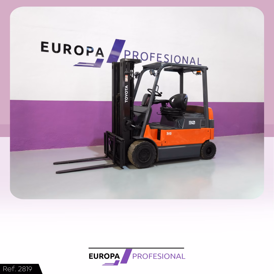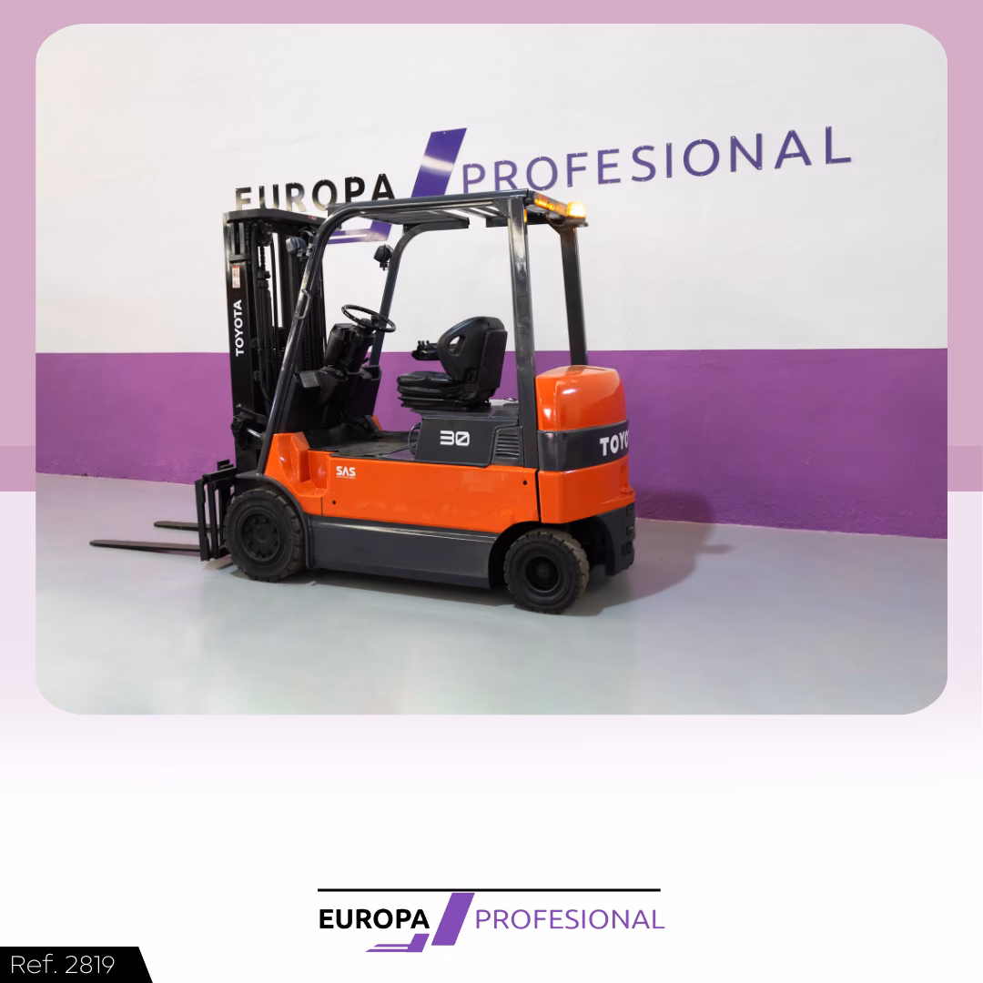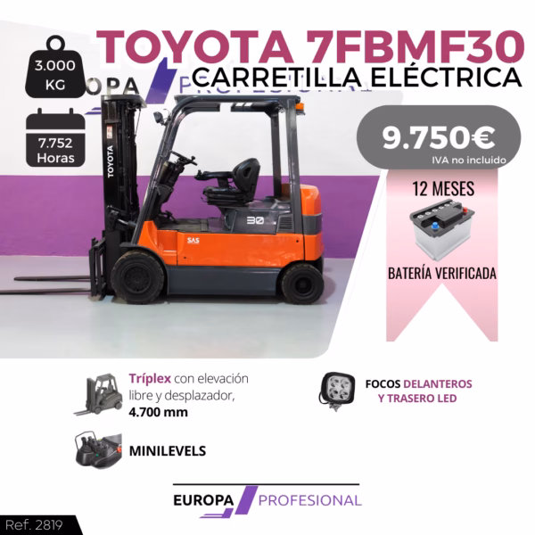 Carretilla eléctrica Toyota. Modelo: 7FBMF30. Con tan solo 7.752 horas. Con 12 meses de garantía en batería verificada. Capacidad: 3.000 kg. Mástil tríplex con elevación libre y desplazador, con una altura de 4.700 mm. Minilevels. Luces delanteras y traseras led. Referencia: 2819