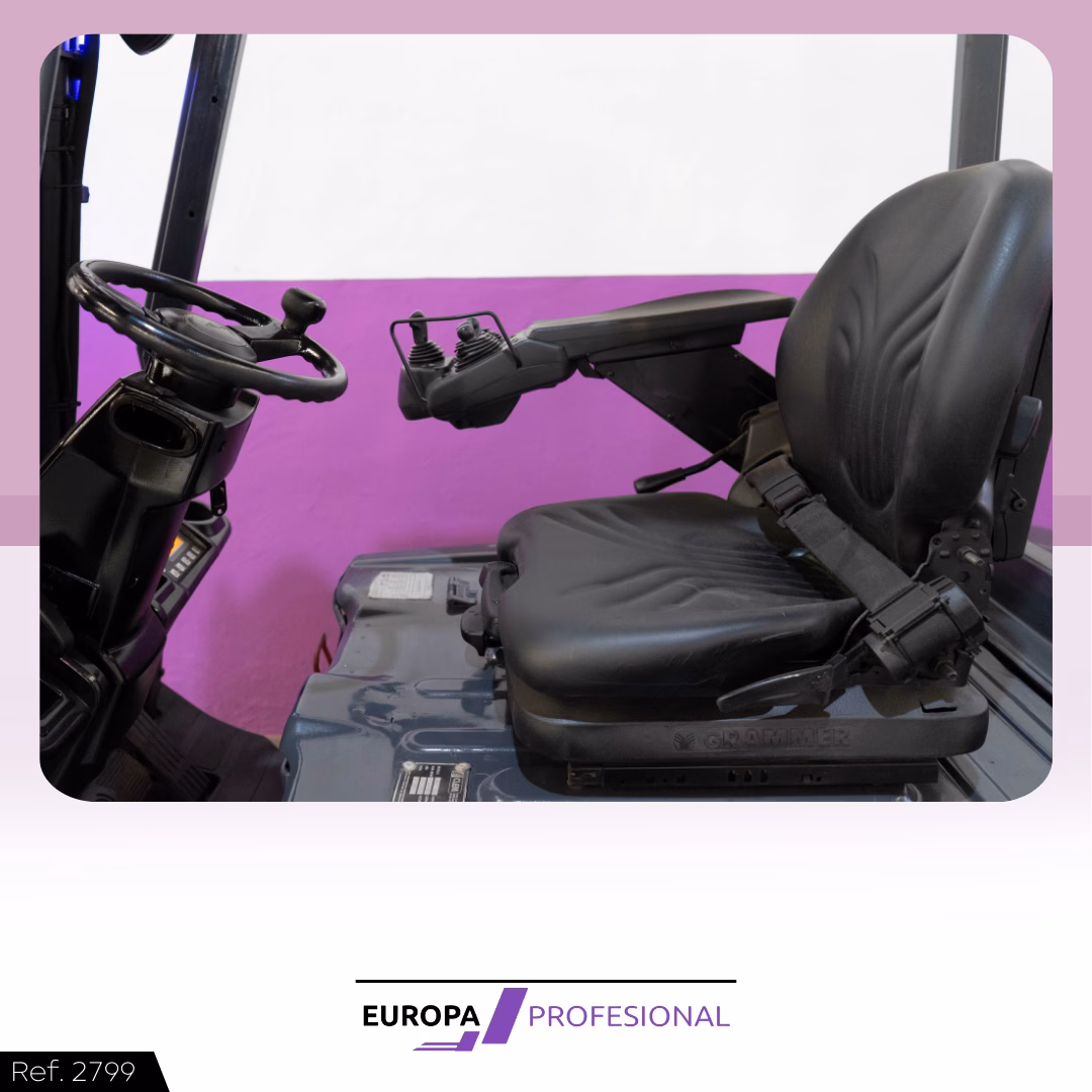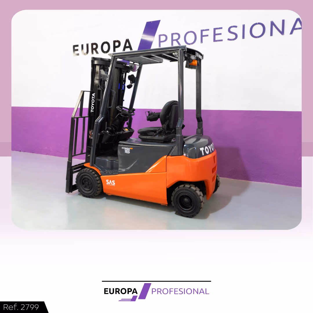 Carretilla eléctrica Toyota. Año 2017. Modelo: 8FBM16T. Batería nueva con 30 meses de garantía en bateria nueva. Capacidad: 1.600 kg. Mástil tríplex con elevación libre y desplazador, con una altura de 4.700 mm. Ruedas nuevas. Minilevels. Luces delanteras LED. Referencia: 2799