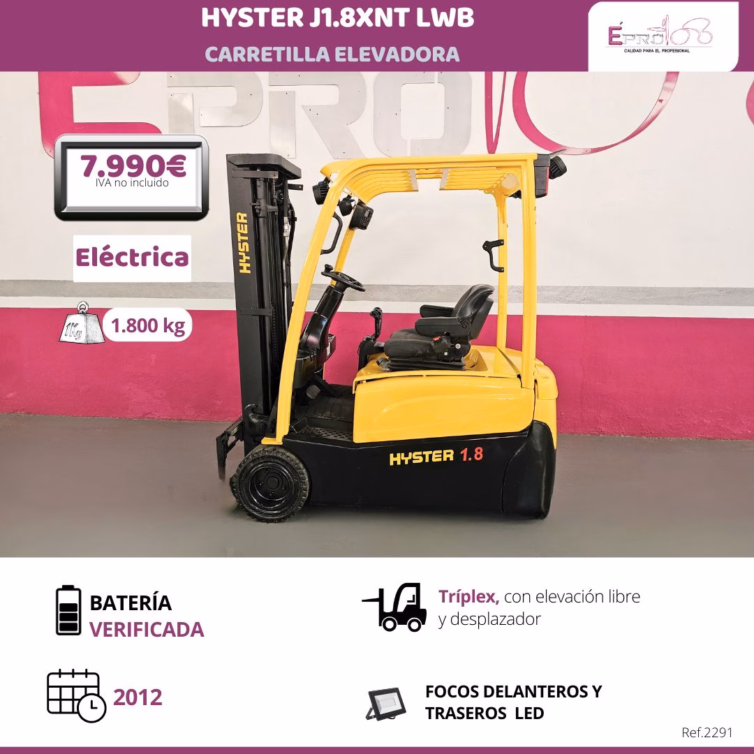 TIPO DE MAQUINA: CARRETILLA ELEVADORA MARCA: HYSTER MODELO: J1.8XNT LWB AÑO: 2012 TRACCIÓN: ELÉCTRICA CAPACIDAD: 1.800 KG MÁSTIL: TRÍPLEX CON ELEVACIÓN LIBRE Y DESPLAZADOR EXTRAS: BATERÍA VERIFICADA, FOCOS DELANTEROS Y TRASEROS LED