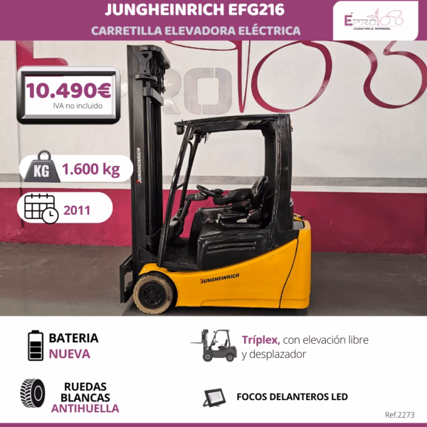 TIPO DE MAQUINA: CARRETILLA ELEVADORA MARCA: JUNGHEINRICH MODELO: EFG216 TRACCIÓN: ELÉCTRICA CAPACIDAD: 1.600 KG MASTIL: TRÍPLEX CON ELEVACIÓN LIBRE Y DESPLAZADOR EXTRAS: BATERÍA VERIFICADA, RUEDAS BLANCAS ANTIHUELLA, FOCOS DELANTEROS LED.