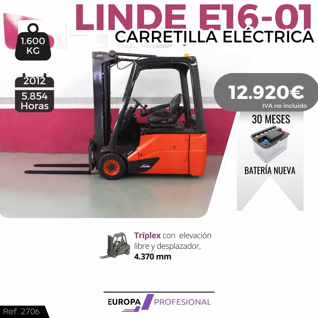 TIPO DE MAQUINA: CARRETILLA ELEVADORA MARCA: LINDE MODELO: E16-01 TRACCIÓN: ELÉCTRICA AÑO: 2012 HORAS: 5.854 CAPACIDAD: 1.600 KG MASTIL: TRIPLEX CON ELEVACIÓN LIBRE Y DESPLAZADOR ELEVACIÓN: 4.370 MM EXTRAS: 30 MESES DE GARANTÍA EN BATERÍA NUEVA