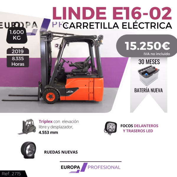 TIPO DE MAQUINA: CARRETILLA ELEVADORA MARCA: LINDE MODELO: E16-02 TRACCIÓN: ELÉCTRICA CAPACIDAD: 1.600 KG AÑO: 2019 HORAS: 8.335 MÁSTIL: TRÍPLEX CON ELEVACIÓN LIBRE Y DESPLAZADOR ELEVACIÓN: 4.553 MM EXTRAS: 30 MESES DE GARANTÍA EN BATERÍA NUEVA, RUEDAS NUEVAS, FOCOS DELANTEROS Y TRASEROS LED