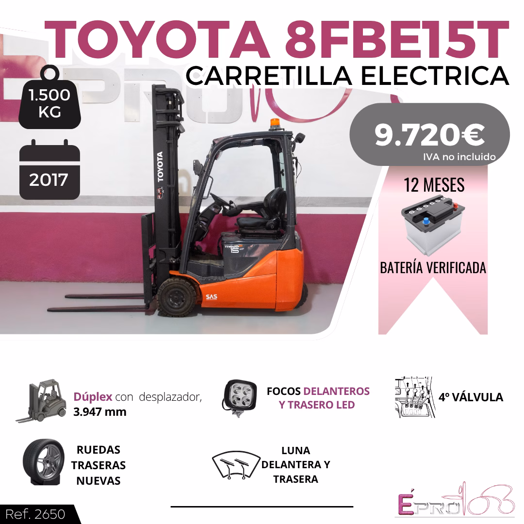 TIPO DE MAQUINA: CARRETILLA ELEVADORA MARCA: TOYOTA MODELO: 8FBE15T AÑO: 2017 TRACCIÓN: ELÉCTRICA CAPACIDAD: 1.500 KG MÁSTIL: DÚPLEX CON DESPLAZADOR ELEVACIÓN: 3.947 MM EXTRAS: 12 MESES DE GARANTIA EN BATERIA VERIFICADA, FOCOS DELANTEROS Y TRASERO LED, RUEDAS TRASERAS NUEVAS, LUNA DELANTERA Y TRASERA, 4º VÁLVULA