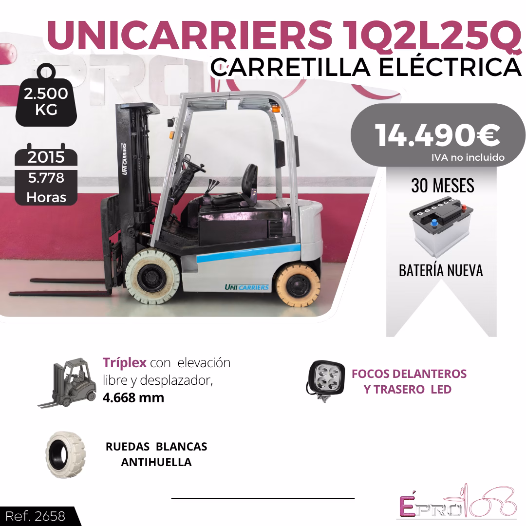 TIPO DE MAQUINA: CARRETILLA ELEVADORA MARCA: UNICARRIERS MODELO: 1Q2L25Q TRACCIÓN: ELÉCTRICA CAPACIDAD: 2.500 KG AÑO: 2015 HORAS: 5.778 MÁSTIL: TRÍPLEX CON DESPLAZADOR ELEVACIÓN: 4.668 MM EXTRAS: 30 MESES DE GARANTÍA EN BATERÍA NUEVA, FOCOS DELANTEROS Y TRASERO LED, RUEDAS BLANCAS ANTIHUELLA